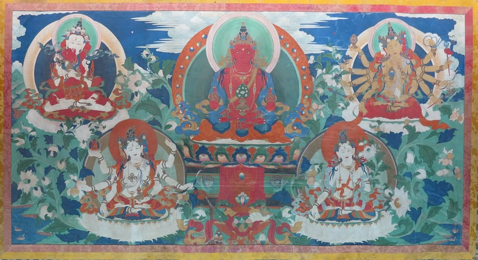 Hình ảnh minh họa: Ba bổn tôn trường thọ gồm Phật Vô Lượng Thọ (Amitayus), Phật Đảnh Tôn Thắng (Ushnishavijaya) và Bạch Độ Mẫu (Sitatara). Bên phải là Tùy Cầu Phật Mẫu (Pratisara), và Bạch Luân Thắng Lạc (White Chakrasamvara), Thành Tựu Thọ Mạng.